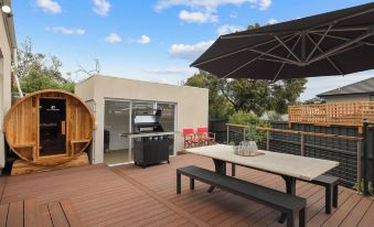 There is a generously sized outdoor deck with large 360 degree swivel umbrella, 6 person powerful outdoor spa, 4 person sauna, large outdoor dining table and BBQ.