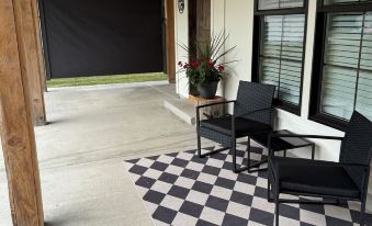There is a lighted covered porch that wraps around to the left you will find the front door entry into The Loft.