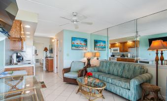 Relax in this 3rd floor Balcony Suite and enjoy a fabulous ocean view. In the living room there is a queen sleeper sofa with a memory foam sleeper mattress and a 32" flat screen TV. A new sliding glass door allows a lovely ocean view and keeps the ocean winds quite. Mirrored walls give a more spacious appearance and tiled floors make the unit easy to keep clean. There is a full kitchen including a 4 burner stove with oven. The bathroom was upgraded with a new vanity, mirror and tub with tiled surround. The private bedroom is lovely in beige with a queen bed. The closet is enclosed with mirrored doors. There is a ceiling fan in the bedroom as well as a small 19" TV. This is in the north section of the building and will allow a small pet. SMALL PETS ARE ALLOWED. TWO PETS MAX. $75 PER PET. NON-REFUNDABLE.