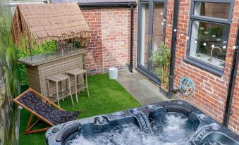 The kitchen window looks out to the back patio where there is a hot tub and tiki bar. There are patio doors out to this Astro turf area in the dining space. The garden is enclosed with a gate at the driveway to keep pets and children safe, however it opens onto a very quiet lane. If you follow the lane up you can go into the woods and down to cromford canal. Perfect for dog walkers.