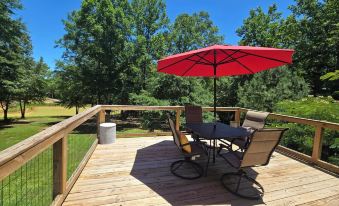 Outdoor Bliss: Step onto the spacious deck overlooking a tranquil pond, an idyllic spot for morning coffee or evening relaxation.