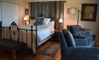 This home offers 2 Bedrooms and 2 Bathrooms on a one level floorplan. A Third Bedroom is offered in an Airstream located on the property. On the Main Entry level there is the wonderful modern Kitchen with a Dining area that boasts a wood burning stove, seating for six and beautiful wood floors and ceilings. There are two separate seating areas in the Living Room and Den, one seating area for viewing and the other seating area with a large media center. The main Bathroom is just down the hall and the 2nd bedroom with Queen Bed is there as well. The Master Bedroom with Queen Bed and Master Bathroom completes the one story level floorplan. All Bedding was selected with "special attention payed to simple luxury and comfort".