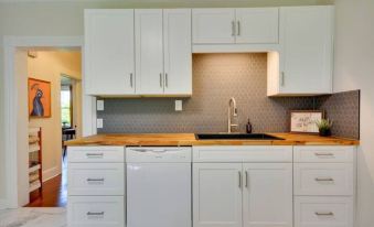 🍳 Updated Kitchen: Butcher block countertops + all the essentials for cooking in — stove, fridge, microwave, dishwasher, Keurig, cookware, dishes, and utensils