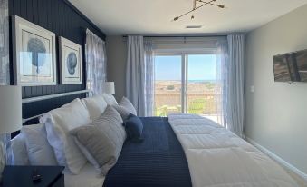 The final feature of the 3rd floor level is a private primary suite with huge king bed overlooking the ocean, smart TV, and private bath. Again, large glass sliding doors in this bedroom allow deck access to sit in the Adirondack chairs and watch the ocean while enjoying a glass of wine at night or coffee in the morning.
