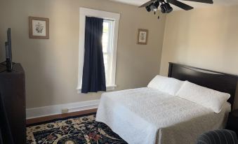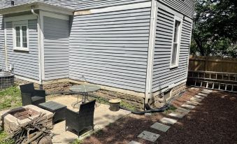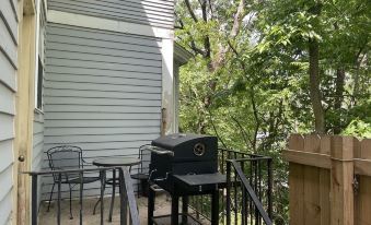 There is a fenced in backyard with a brick patio/firepit, back stoop and grill. The lot is shared with The Renwick Mansion, and has plenty of space on the four acres that is near the guest house to explore and play yard games. There is on street parking and off street parking at the end of the lot shared with Renwick as well.