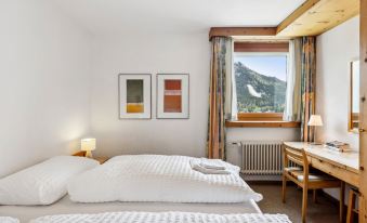 Davos: Apartment block "Guardaval (Utoring)". In the resort, in a central, quiet, sunny position on a slope, 1 km from the lake, 300 m from the skiing area. For shared use: indoor pool. In the house: reception, lounge with TV, WiFi, sauna (extra). Playroom, lift, storage room for skis, central heating system, washing machine (for shared use). Bread roll service and beverage service. Narrow motor access to the house. Roofed, parking (limited number of spaces, extra), communal covered parking (extra). Shop 300 m, restaurant 300 m, bus stop, railway station "Davos Dorf" 400 m, indoor swimming pool 1 km, bathing lake 1 km. Mountain railway, skisport facilities, slopes, ski school, sled run 1.5 km, cross country ski track, ice rink 300 m. Well-known ski regions can easily be reached: Parsenn 300 m, Jakobshorn 1.5 km. The building is located upstream of the resort of Parsenn mountain and offers beautiful view. Parking + garage (reservation on arrival). 2-room apartment 65 m2 on 5th floor, south-east facing position. Comfortable and rustic furnishings: living/dining room with 2 fold-away beds and cable TV (flat screen), radio. Exit to the balcony. 1 room with 2 beds. Kitchen (oven, dishwasher, 4 ceramic glass hob hotplates). Bath/WC, sep. WC. Balcony 7 m2. Beautiful view of the mountains, the countryside and the resort. Facilities: Internet (WiFi, free). Parking. Please note: non-smokers only. 11414