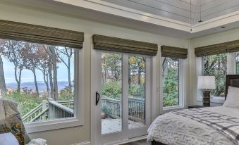 The master bedroom on the main floor has a vaulted ceiling, king bed, and recently updated bathroom with dual sinks and a shower. Enjoy sunrise views over the mountains from your bed. Another main level bedroom has a queen bed, ensuite bath with tub/shower, and a private balcony. The terrace level includes the Cardinal Room with a queen bed and forest views, and the Bear Room with a full-size bed. The recently updated bathroom has a tub/shower and sink in one room, and a separate toilet and sink.