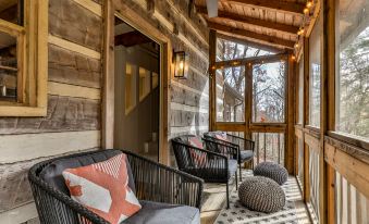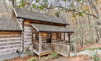 Enter the beautifully restored timber and white chink cabin through a rocking chair front porch into the open-plan dining, living area, and kitchen. The living area offers beautiful views of the wooded glen through multiple windows and a treehouse-like screened back sitting porch. Downstairs, a second living room with a TV is perfect for movie night or the game and features a stylish electric flat-screen fireplace. Behind the living room is a second screened porch sitting area, a great spot to listen to the creek or read a book. Outside, nestled at the back of the cabin, is a beautiful fire pit, perfect for relaxing and enjoying nature and the sounds of the nearby creek.