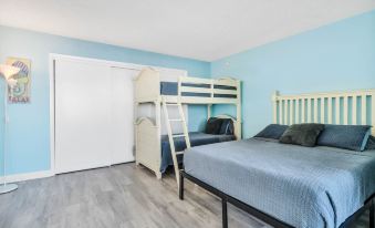 The second bedroom features a twin over full bunk bed, next to an individual queen bed with direct balcony access. The second bathroom is located across the hall from this room and features a single vanity/sink with a gorgeously renovated walk in shower.
