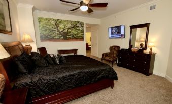 • Master bedroom suite with king size bed, walk-in closet, sitting area, wall mounted TV with cable, as well as direct balcony access. Large master bath with dual head shower, garden tub, and his and her vanities/sinks