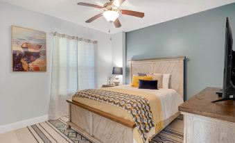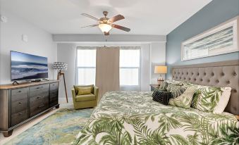 ~Master suite: Features a king bed, large Smart TV with cable, dresser, walk-in closet, and a private spa-like bathroom with double sinks and a walk-in shower. Enjoy breathtaking sunset views right from your room.