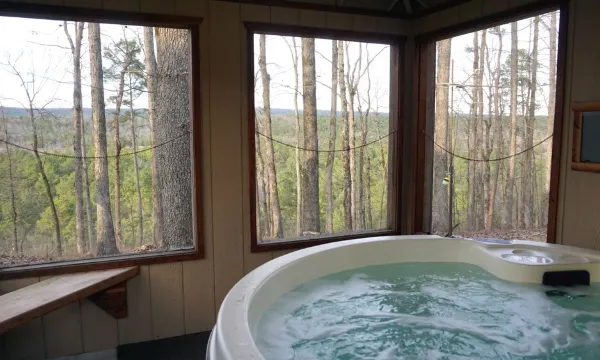 Every season is the perfect time to visit Hidden Ridge Cabins. Come relax and rejuvenate in our couple’s cabin nestled on 16 secluded acres overlooking the Ouachita Mountains. Your cabin features a private 2-person Jacuzzi tub or you may wish to use the larger enclosed 500 gallon Hot Tub (shared with another cabin).