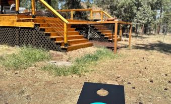 OUTDOORS/PROPERTY: The greater than 5 acre property boasts a large entertaining deck off the great room with an outdoor grill, comfortable outdoor seating and dining area, 6 person waterfall spa with discreet night lights, the most spacious deck hammock in Central Oregon for relaxing/stargazing and a full weight set. Around the property is a greenhouse with fresh vegetables, Golf swing net, second hammock, cornhole set with bags and friendly chickens providing fresh eggs.