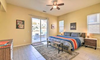 This desert oasis has everything you need. The huge living room opens to the dining area with settings for 10. The open kitchen with bar and island is fully equipped. A corner desk in the kitchen is a great work station. Bedrooms are down the hall with the 1st full bathroom--with separated toilet/shower door so other guests can use the double sinks. All bedrooms have queen size beds and room for luggage. One bedroom is oversized with extra futon couches and room to hang out. The 5th master bedroom (Cal King bed) has another desk (WFH!) a huge ensuite bathroom with tub and separate tiled shower. You can get to the back patio through the dining room or the master bedroom. Th patio sparkles with the pool, hot tub, plenty of seating and upper terrace to watch the cityscape with your coffee or wine. Laundry is also available. A/C included and room to park in the driveway. Pool heat available on request for seasonal fee.