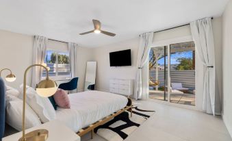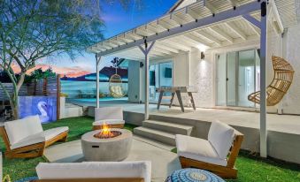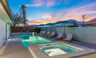 Discover Rather Be Designer Casa, a desert-inspired gem in Desert Hot Springs. Unwind in the optional heated pool & hot tub, both adorned with a stunning custom mural. Dine under the pergola or gather around the cozy firepit. Inside, enjoy designer-styled rooms, modern gold-accented baths, & a one-of-a-kind “confession” game room. Located 12 miles from Downtown Palm Springs & 27 miles from Joshua Tree, with nearby spas, trails & local eateries—your dream desert getaway starts here!