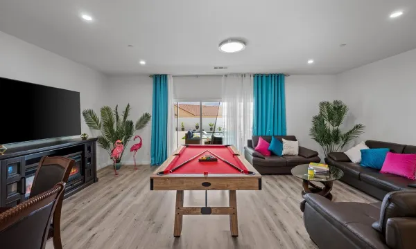 Inside, fun awaits in the spacious game room, featuring a poker table, pool table, foosball, and a variety of board games—perfect for friendly competition and laughter-filled nights.