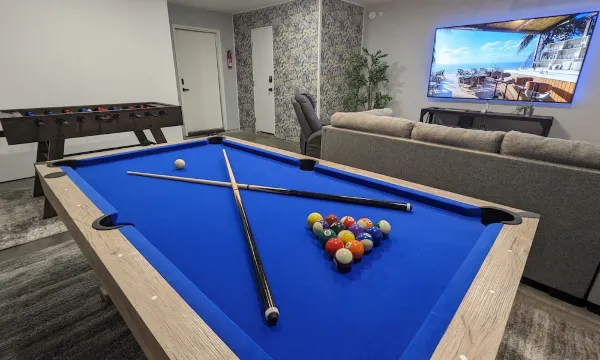 The garage has been converted to a game room equipped with a pool table, foosball table, games, and an enormous smart TV for streaming your favorite movies and shows, or use the easily accessible HDMI connections to connect your personal video game systems.