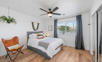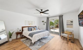 This clean and bright 3 bedroom, 2 bathroom home is perfect for comfort and relaxation. The kitchen comes fully equipped with pots, pans, cookie sheets, crock pot, blender, coffee maker, electric kettle, French press coffee maker, toaster and more. In the living room, you will find a comfortable couch, 55" smart TV, travel books, and games. Two of the bedrooms feature queen beds with memory foam toppers (twin trundle in one of these rooms), luggage rack and charging cables for your phone. The primary bedroom features an en-suite bathroom with dual sinks and a bathtub/ shower, king bed with memory foam topper, tv, bedside lamps, luggage rack, and sliding glass door leading to the outdoor pool space.