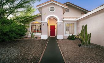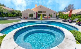 This remodeled home includes a heated pool/spa with 2-hole mini golf, corn-hole, Air-Hockey, fire pit, colored desert rocks, and more!