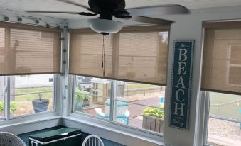• 2 wicker chairs, matching wicker loveseat, table, 2 chairs (in addition to the dining chairs in the living area), a bench, and a shoe bench with 1 double empty milk crate for your shoes, wall-mounted SMALL flat-screen TV. In November 2023, we upgraded the windows in the sunporch, and they are open to enjoying the ocean's summer night breeze. In March 2024, we changed our sunporch blinds to wireless motorized blinds that can only be raised or lowered by remote.