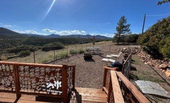 Nestled amidst serene surroundings, this beautiful 325 sq. ft. cabin offers a secluded retreat for those seeking tranquility. Step inside, and you will find tasteful and beautiful decor that enhances the cozy ambience. The front porch adds a charming space to unwind and soaking nature’s beauty. This cabin, the perfect blend of seclusion and comfort invites you to experience a peaceful escape into a world where simplicity meets elegance. You won’t want to leave this charming one of a kind place. The house in cabin are located on 4 acres and Dewey Arizona. Located only one hour from Phoenix and 30 minutes from downtown Prescott. Guests will have access to a cozy fire pit area with charcoal bbq and secluded Jacuzzi (24 advanced notice required). Local attractions are right down the road; Mortimer farms, and Left-T’s Steakhouse are just minutes away!
