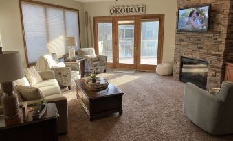 Fully equiped 3 bed, 2 bath beautiful waterfront condo. In condo W/D, full kitchen, internet, deck with grill. This condo has a pool directly below the deck and 6 passes to the indoor water park on property. The resort has 2 restaurants/bars. It is close to Arnolds Park.About pets:No pets allowed.About checkOut:Check out before 11:00 AM.About children:Children allowed: ages 0-17.About customRules:No Bachelor or Bachelorette Parties allowed.About checkIn:Check in after 3:00 PM.About smoking:Smoking is not permitted.About minBookingAge:Minimum age to rent: 25.About events:No events allowed.