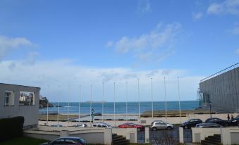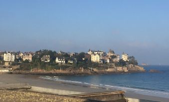In the very center of Dinard, 20 meters from the beach at l'Ecluse, the indoor swimming pool (Olympic, sea water) and the Clair de Lune promenade, opposite the Palais des Festivals and the Casino, 200 meters cinema and close to all shops and restaurants, 5 minutes walk from the Dinard market.