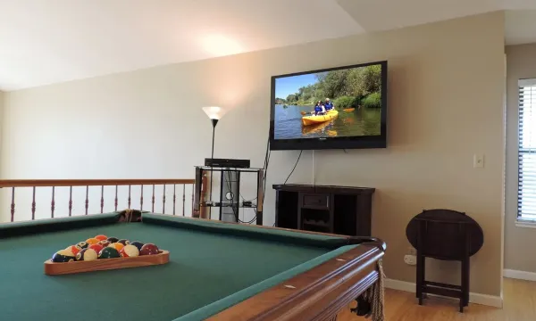 Pool table, chess board table, 2 bars, a big family room, fireplace, 3 TVs, Netflix in 2 tv's, wireless internet, a DVD player, sound system with Bluetooth, workstation with a printer connected to wifi, books, movies, and games. Outdoor furniture includes a dining set for 6 with an umbrella, 6 lounge chairs, fire pit with a set of four patio chairs, 2 hammocks, 6 stack chairs, a portable icebox and a grill.
