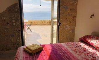 My house is of recent construction, rehalized in stone as inspired by the traditional architecture of the Mani. It is situated between Agios Nicholaos and Pigi at 180 m above sea level, about 40 km from Kalamata airport and enjoys an extraordinary view over the bay of the Messinian gulf. Within 30 km, between Agios Nicholaos and Kardamili, you can find clear sand beaches, pebbles and inlets with turquoise sea water.