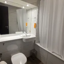 Отличный отель, прекрасный выбор как для обычного проживания, так и для транзитной остановки. В номерах есть ванна, но имейте в виду, что зубная щетка, паста и тапочки не предоставляются. Однако, поскольку везде ковровое покрытие, ходить босиком вполне комфортно.