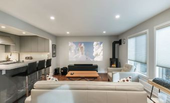 When you arrive at the home, there is a large lockable exterior closet, perfect for storing your skis and outdoor gear. You will step through the stylish entryway with a functional built-in bench and storage. Directly to the left of the front door is the beautiful kitchen, a space with all the upgrades a chef could dream of, including high-end appliances such as a Wolf gas cooktop, oven, and custom hood. Inside the fully-equipped kitchen, you will find everything you need to prepare a delicious meal for your group, as well as a comfortable kitchen bar with three bar stools providing a great spot to grab a bite to eat, or for additional seating in the main living space. On the other side of the kitchen you will find the bright living room, outfitted with a leather couch and a leather club chair; the high-end furnishings beckon you to sink in and relax. Large windows fill the room with ample natural light, and a modern gas fireplace brings a warm ambiance to the room, creating an inviting and relaxing atmosphere. Take your movie nights to the next level with the home theater, which boasts a Dolby Atmos surround sound and a 150" projected image! From the living room, you can also step out to the private back deck, a fenced area great for stepping out to take in the fresh mountain air.