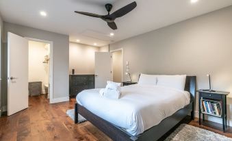 When you are ready to settle in for the night, you will find the home’s two bedrooms located on the upper level. The separation of space between the sleeping area and common space makes for a quiet environment for everyone in your group to get a good night's sleep! The first bedroom boasts a queen-size bed with a full-size dresser and a spacious walk-in closet, providing ample space to store your belongings during your stay. This room is fully equipped with everything you need for a comfortable stay including smart blinds that automatically close for evening privacy and open with the morning sun, a smart fan, and a wireless speaker. South facing windows line the wall of the bedroom, framing a lovely view of quaking aspens that can be enjoyed from the comfort of bed. The second bedroom is great for those needing to keep up with remote work as the room features an adjustable desk, an office chair, a printer, ethernet, and a computer monitor. At nighttime a twin-size bed awaits you, with a closet, smart blinds, and a wireless speaker adding to the comfort of this dynamic room. Conveniently located near the two bedrooms is a full bathroom. This luxurious space features a floating single-sink vanity with a smart mirror above, radiant floors, a heated bidet, and a spacious walk-in shower with a glass wall.