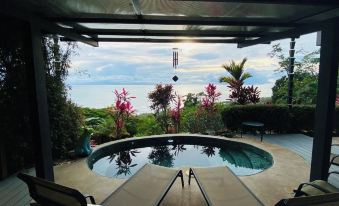 The Villa is located on the main floor and is an open concept studio that offers a breathtaking 180 degree view of the ocean! There is a NEW QUEEN sized bed, a fully equipped kitchen, AC, high speed fiber optic internet/WiFi and private bathroom with HOT WATER. The living space is bright due to its floor-to-ceiling glass sliding doors that offer an indoor-outdoor flow onto a covered spacious patio. On the patio you will find two cozy swing chair hammocks to relax in while viewing the beautiful toucans, scarlet macaws, monkeys and other exotic wild life. You can also enjoy watching spectacular sunsets or enjoy a romantic dinner. On the patio deck area you can dip in the pool or retire on the lounge chairs while reading your favorite book. A gas barbecue grill and concrete table with benches are also available for outdoor dining. The property lies on an acre hillside land that displays a beautiful landscape of different tropical palms, trees and plants.