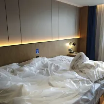 Простыни и одеяла плохо выстираны, а уровень щёлочности слишком высокий. Мне некомфортно спать, не развалившись.