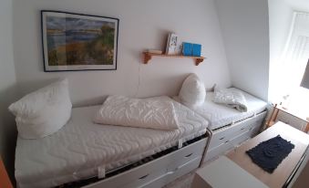 Large, light-flooded (approx. 90 sqm), nicely furnished non-smoking house for max. 6 people in a quiet cul-de-sac, 5 minutes walking distance to the center with shops, restaurants, pedal boat rental (depending on the season), playground .. 1000 m / 15 minutes on foot along the grinding bosom to the beach. Very high quality and particularly child-friendly equipment! On the ground floor there is a large living room with a TV, DVD player, play area and sun-drenched oriel with dining room. Kitchen with dishwasher (new 2017, Bosch), fridge-freezer (new 2017), oven and all necessary electrical appliances. Shower room on the ground floor, a second shower room on the upper floor, so that really several people can spend a relaxing holiday together. Washing machine available. Allergy-Free! 3 bedrooms, one with a double bed, one with 2 single beds and the loft with 2 further single beds. Enough closets in all rooms. Shutters in front of all windows, e.g. T. Fly screens.