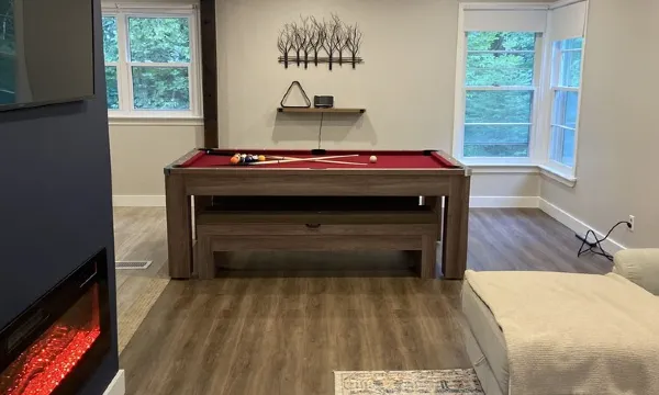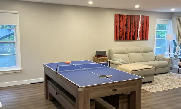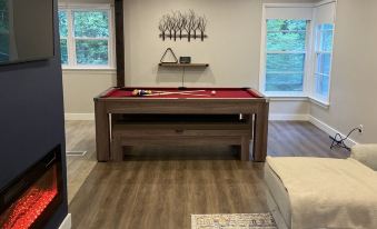 We have a playground ,sandbox ,small plastic pool , fire pit, 2 smart TVs , pool and pong table in one ,foosball table , dart board and a indoor electric fire place . We also have two adult bikes and two children bikes.