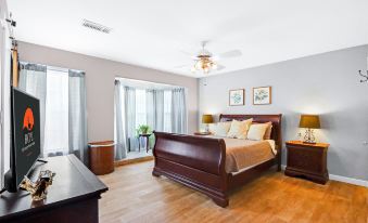 Sleeping up to 7 guests, the home features three beautifully appointed bedrooms, each with a plush queen-sized bed, and one room offering an additional twin bed for flexible sleeping arrangements. Designed with adults in mind, the calming neutral color palette, original hardwood floors, and curated antique furnishings create a peaceful, boutique-style atmosphere throughout the home.
