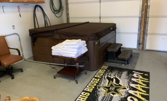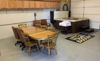 This unique steel structured house offers all the amenities a house has to offer. The main living space has one master bedroom with queen bed and full bath and TV, and one loft bedroom with queen bed and half bath and TV. There is full kitchen fully stocked with cooking and eating supplies. There is a spacious living room and dining area. There is a washer and dryer room with a full bath. Just out the back door is 2 newly constructed bunk houses that each sleep 4 and have their own full bath. Just past the bunkhouses is a 24x28 heated shop. The shop is a great place for the larger gatherings as it is equipped with refrigerator, smoker, large dining table, and a black stone griddle. This is set up to be a great area to feed and entertain. At the end of the day open up the shop door and relax in the large 7 man hot tub while checking out the beautiful wind river mountain range, or gather around and play games. Also there’s a fire pit to relax by also.