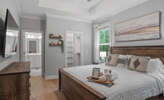 Lovely primary suite with a tray ceiling & walk-in closet. Beautiful views of backyard from the windows. New king size bed with brand new luxurious 12” hybrid memory foam mattress from Casper. Dual nightstands with matching night lamps. Beautiful decor and lovely ZZ plant. Magnetic charging station. Lovely dresser with lots of storage. Pamper yourself with some lovely scented candle and delicious chocolates while watching your favorite shows on the 55” smart TV with Fire TV stick. Luxurious linens, super soft quilt and cozy king size blanket for colder nights. A comfortable chair to relax. Large walk in closet with shelves and hanging space (with hangers). It stores a full size folding crib, pack n play and folding high chair. Luggage rack for your convenience.
