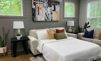 New king size bed with brand new luxurious 12” hybrid memory foam mattress from Casper. Dual nightstands with matching night lamps. Beautiful decor. Magnetic charging station. Unwind and watch your favorite shows on the 44” smart TV with Fire TV stick. Luxurious linens, super soft quilt and cozy king size blanket (in pretty basket) for colder nights. Large closet with lots of hanging space (with hangers). Luggage rack for your convenience.
