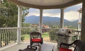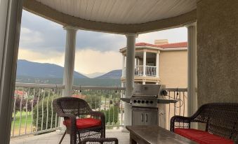 Panoramic view of the mountains from the balcony. Relax, enjoy a glass of wine or your favourite drink while watching golfers tee off or watch the sunset. This luxurious condo unit has 2 beds. Fully equipped kitchen, washer and dryer, large screen TV, BBQ grill on the balcony, AC, gas fireplace, a perfect quiet place where you can relax on the patio. Close to all amenities, golf courses, hot springs pool, beach, hiking, skiing, adventure park & other activities. Perfect home away from home
