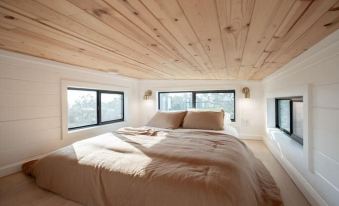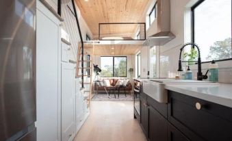 This new Tiny home has two loft bedrooms with queen beds. It has all the amenities of home with a kitchen, bathroom with a shower and even a washer and dryer.