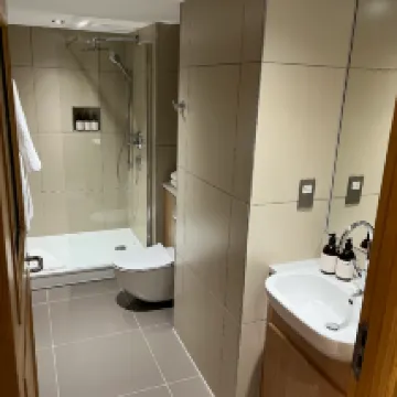 Чистота: В ванной комнате были отдельные влажная и сухая зоны, много воды, и она была чистой.