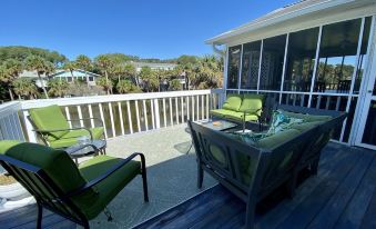 EDISTO BEACH! Partial Ocean View. Screened porch. Block to beach. 1900 sq. Ft. 4 bed Fenced yard, Waterfront with dock! Walk across street to the Atlantic Ocean, Entrance #3. Screened porch Pet friendly. Private cul de sac. no thru traffic. Safe area for kids on bikes. Walkable to restaurants, grocery store, & ice cream shop. Lagoon in back for fishing and crabbing. XFINITY FAST WIFI, DOG FRIENDLY