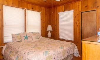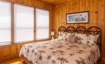 4BR / 2BA - K, Q, K, 2S - Sleeps 8 - Short walk of ~ 100 yards across the street to the beach! A classic Edisto Beach cottage with pine walls, floors and ceilings. As you enter the ocean view screen porch you are greeted with lots seating and even a dining area. Adjacent to the screen porch is a door to a side sundeck, also with ocean views. From the porch you enter the living area of the home. A dining area and a large eat-in kitchen, with a breakfast bar and stools, connects to the living space. To the right side of the great room is a bedroom with a king size bed. There is a bath with a stall shower in the hall on this side of the home and another bedroom with a queen bed. On the left side of the property is a 3rd bedroom with 2 singles and ocean views. Next to the dining area is the 4th bedroom with a king size bed and a door to a connecting bath. This bath also opens into the central portion of the home. The laundry room is next to the kitchen.