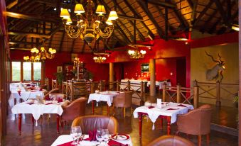 Game lodge far away from Etosha park. Large British colonial design with a big pool and bar. Rooms are UPHILL on large cobble stone walkway and golf carts NOT always available (or charged in my case, so it stopped working part way up and started sliding back down hill!!!). Rooms/cabin is huge with lots of space and nice balcony. awkward design as storage area so far away from bed. Bathroom is very spacious with large tub plus indoor/outdoor shower. Given the less than convenient walk to room, would have hope to have internet in room but only in main building. Food was adequate