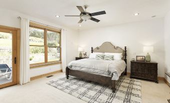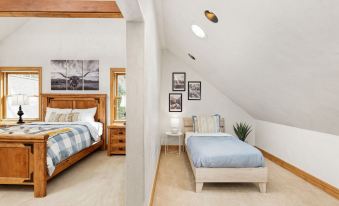 The first floor also hosts the master suite with a king bed and full five piece washroom with jetted tub for relaxing after a day on the slopes. Two additional bedrooms, each with a queen bed, as well as a full bathroom are also located on the ground level. Both large bedrooms upstairs are perfect for families with children as they each have a queen bed as well as one/two twin beds. There is also a full bathroom upstairs with a large tub, shower and a double vanity.