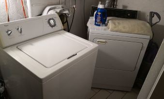 The basement is your space, there is everything you could need. You're welcome to use the washer and dryer it does only have cold water hookup though. Upstairs is MY SPACE. Sometimes I do have friends over so please do be RESPECTFUL OF US if using the backyard or hottub. You have a small fridge and microwave and small convection oven downstairs. Please don't use the toaster oven and microwave at the same time or it will BLOW THE FUSE. If that happens it is very easy to reset.
