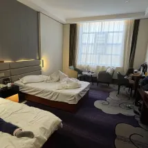Перед отелем есть парковка, большая, удобная и бесплатная. В день моего приезда на первом этаже был банкет, который был очень оживленным, из-за чего парковочное место у двери было немного тесным. Комната была немного неожиданной, большой и чистой. Ванная комната также просторная, разделена на влажную и сухую зоны. Еще есть зеркало для макияжа, что слишком удобно для девочек. В номере есть бумажные полотенца и бесплатная минеральная вода. В туалетных принадлежностях также есть бритвы. Недостатки: 1. Воды в ванне слишком мало. 2. Завтрак, принесенный в номер, до 9 часов. Если вы уйдете в 8:35, завтрак не будет полным. Я начал убираться в восемь пятьдесят и закрыл дверь ресторана вовремя, в девять часов. В ресторане серьезные отходы. Целые тарелки с фруктами, макаронами и т. д. бросаются на стол, не будучи съеденными. Отелю рекомендуется усилить руководство. 3. Отель находится недалеко от окраины города Эрлянь, и здесь мало мест, где можно поесть или сделать покупки.