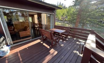 License # 3031 Free standing cabin in a quiet area, has a large deck with wonderful views and a HOT TUB to enjoy the views, gas BBQ grill, Full kitchen, internet with Wi-Fi, large smart TV in living room and smart tv's in the two bedrooms with new queen beds, cabin is for four people, a pack and play is available upon request (infants are not counted as part of the 4 people limit), combo washer/dryer, in town location close to everything. Everything is new on the inside, from the kitchen items to furniture and mattresses. About pets:No pets allowed.About checkOut:Check out before 10:00 AM.About children:Children allowed: ages 0-17.About checkIn:Check in after 4:00 PM.About smoking:Smoking allowed: in designated areas.About minBookingAge:Minimum age to rent: 25.About events:No events allowed.